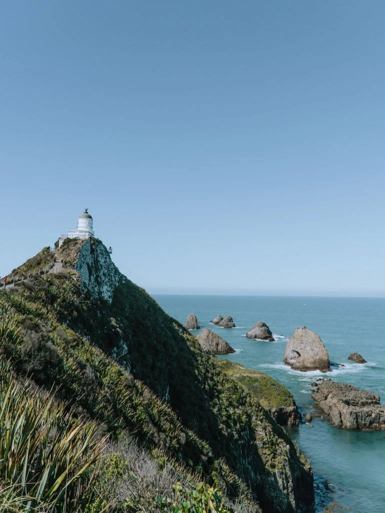 A squat lighthouse perches on a steep headland overlooking the βNuggets' β rocky islets dotting the water below.