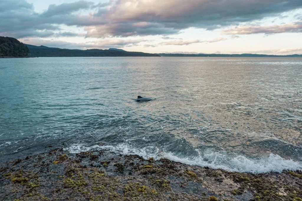 The distinctive rounded fin of a Hector’s dolphin, in a bay near a hut on the Hump Ridge